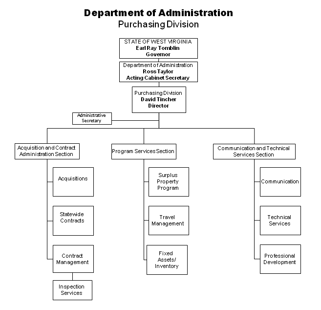 1.5 Organization: The Purchasing Division is organizationally structured under the West Virginia Department of Administration. The sections within the division are detailed below: